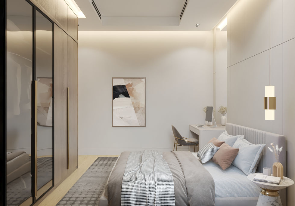 تتوزع الإضاءة بشكل مدروس يبرز جمال المواد ويضفي على المكان لمسة من الفخامة غير المتكلفة. ويظهر ذلك بوضوح في الأشرطة الضوئية الأرضية المدمجة التي تضيء المسارات برقيّ، بالإضافة إلى استخدام المرايا لتوسعة المساحة بصريًا وتعزيز الإشراق الطبيعي.